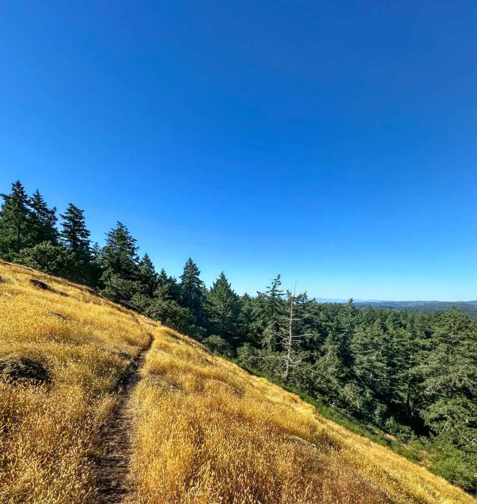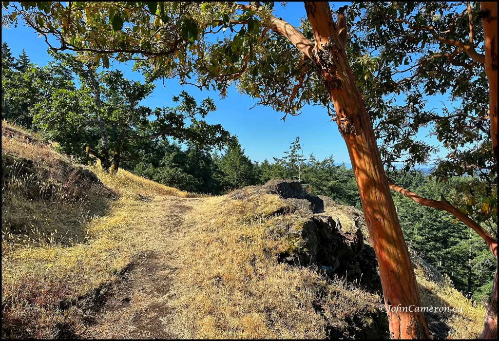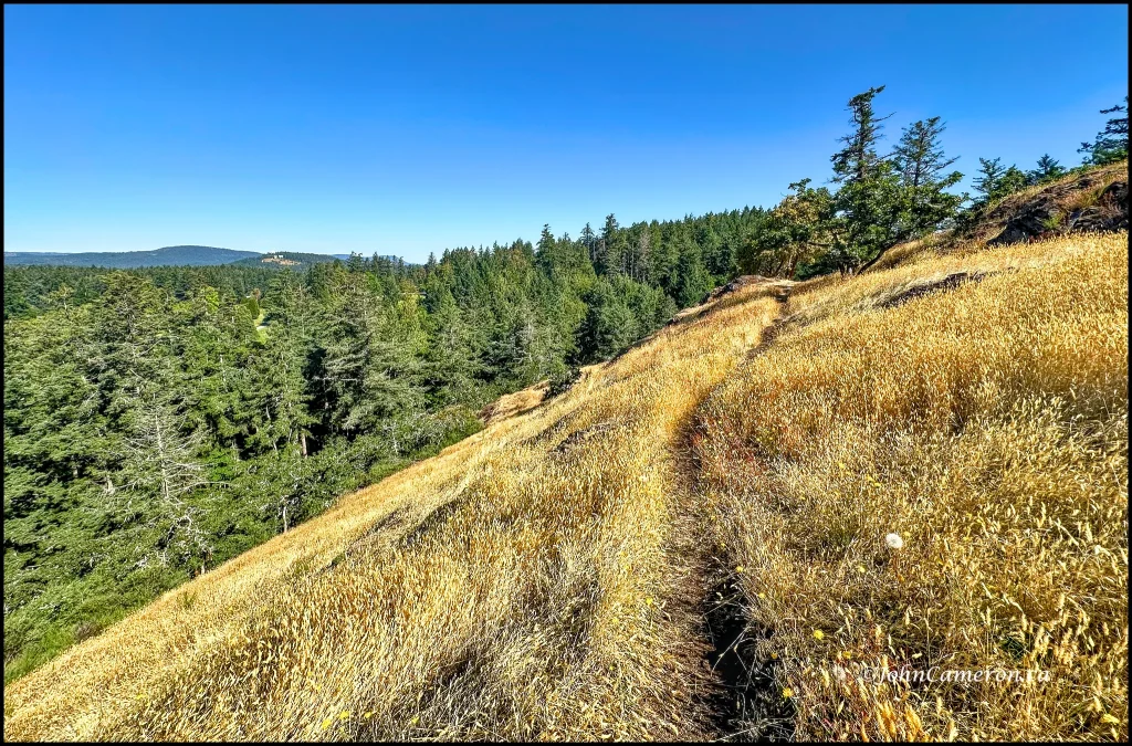 On our local summit trail, the signature 180 degree view is across Haro Strait and from the Gulf Islands to the north, to Mount Baker to the east and to the Cascades Mountains in the south.
