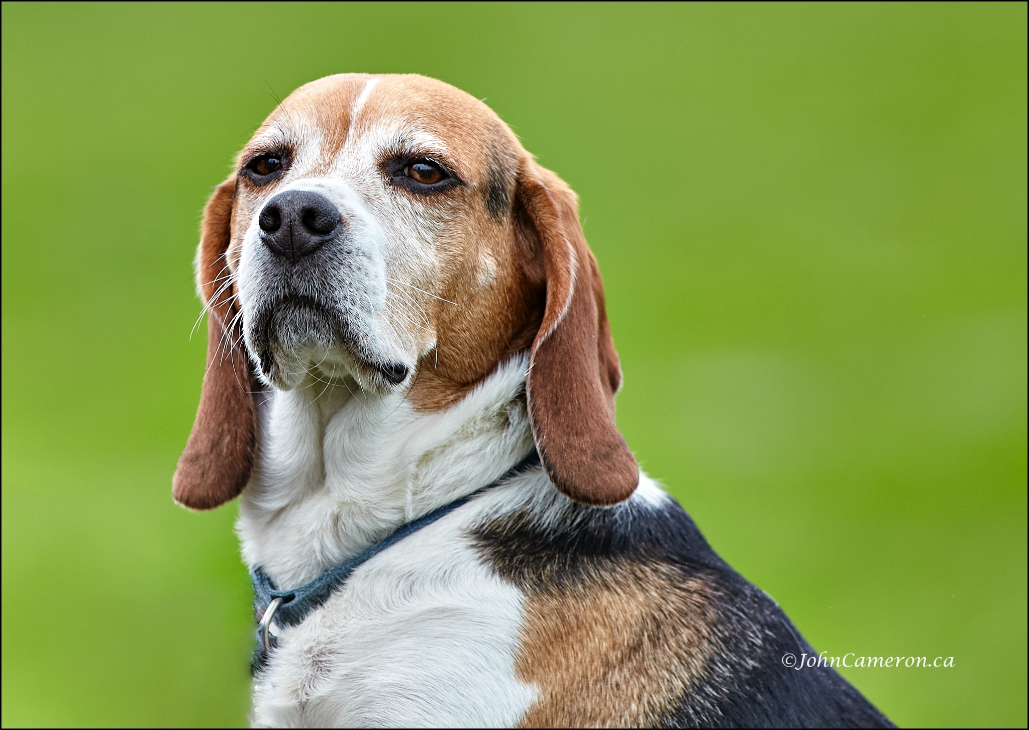A man and his dog sitting on the grass at a soccer game. The studio-like green background is soccer field grass on an overcast day. Choosing a shallow depth of focus (example f/4 as below) keeps the beagle in sharp focus but reduces all definition of the soccer field grass behind.