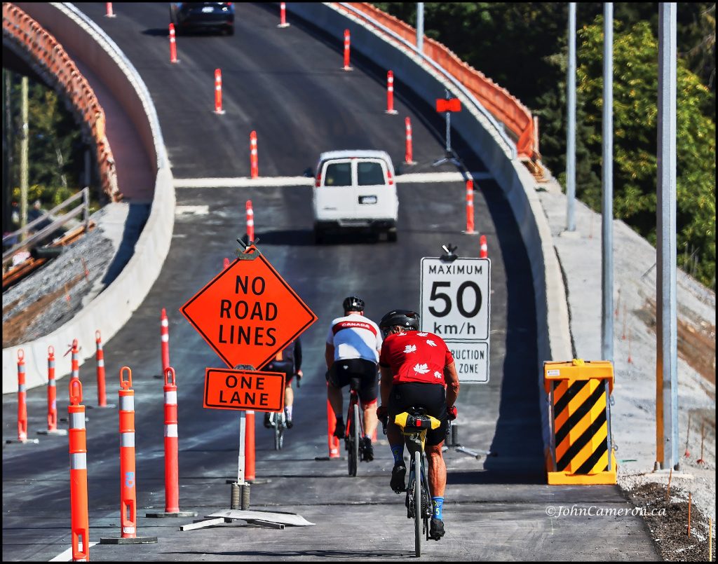 These three 9:30 a.m. bike riders below were merging with cars and trucks heading up the ‘flyover’ to Keating Cross Road. I watched as they initially stayed right, then realized the cones on the right side got closer and closer to the concrete wall. Eventually, they just rode up the flyover in the “one lane” with the traffic.