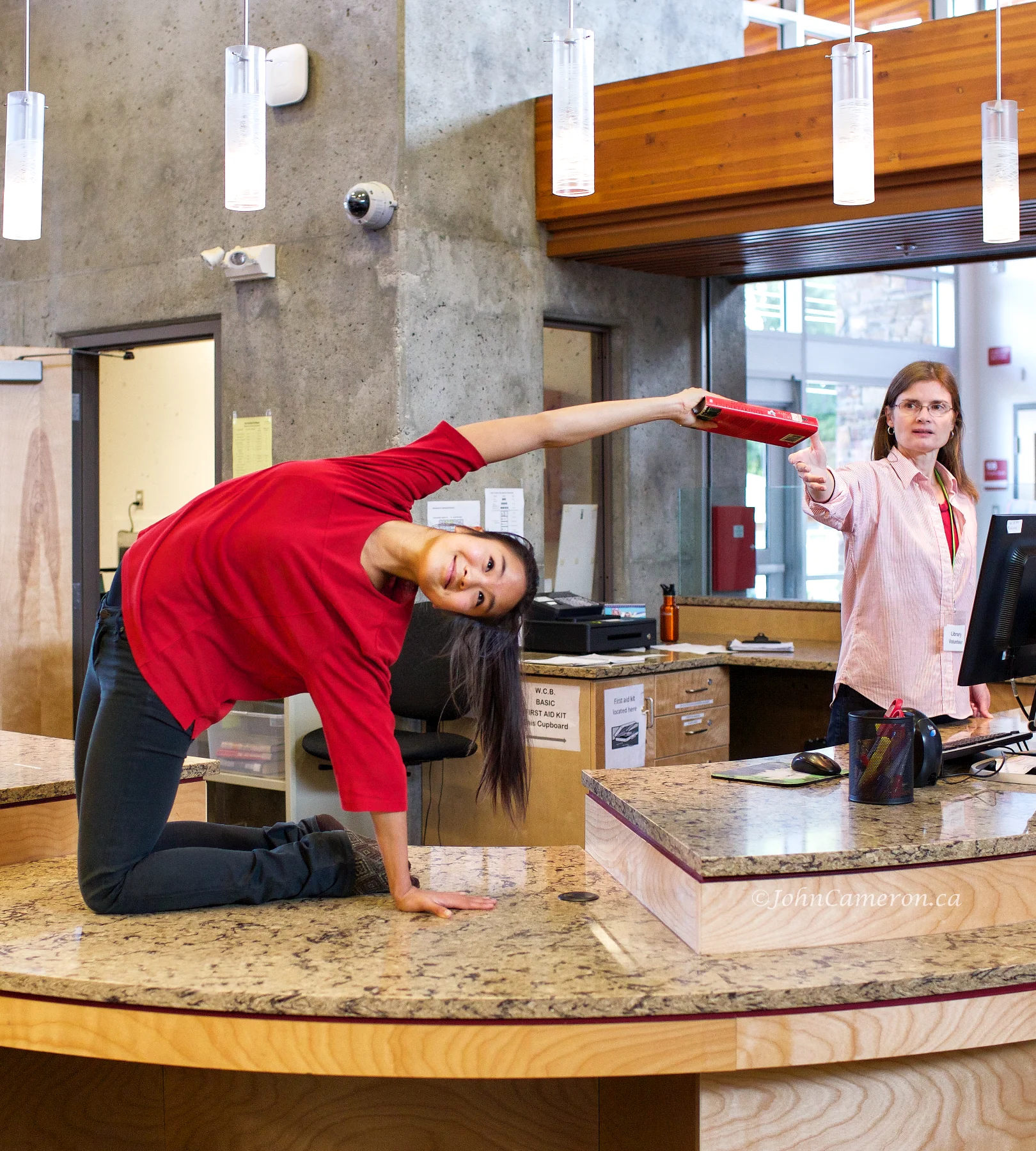 She was keen to help me with an idea I had for an interior photo in the Library entrance. And she was also a GISPA dancer so we were able to do the above image with one take. (background lobby artwork is by Salt Spring artist, Ron Crawford).