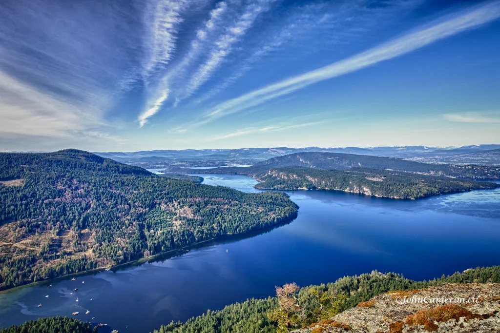 Below: This is an unofficial Mount Maxwell lookout showing Burgoyne Bay (left bottom, with anchored boats), and Sansum Narrows and beyond toward Cowichan Bay (centre) with jet contrails and clouds above.
