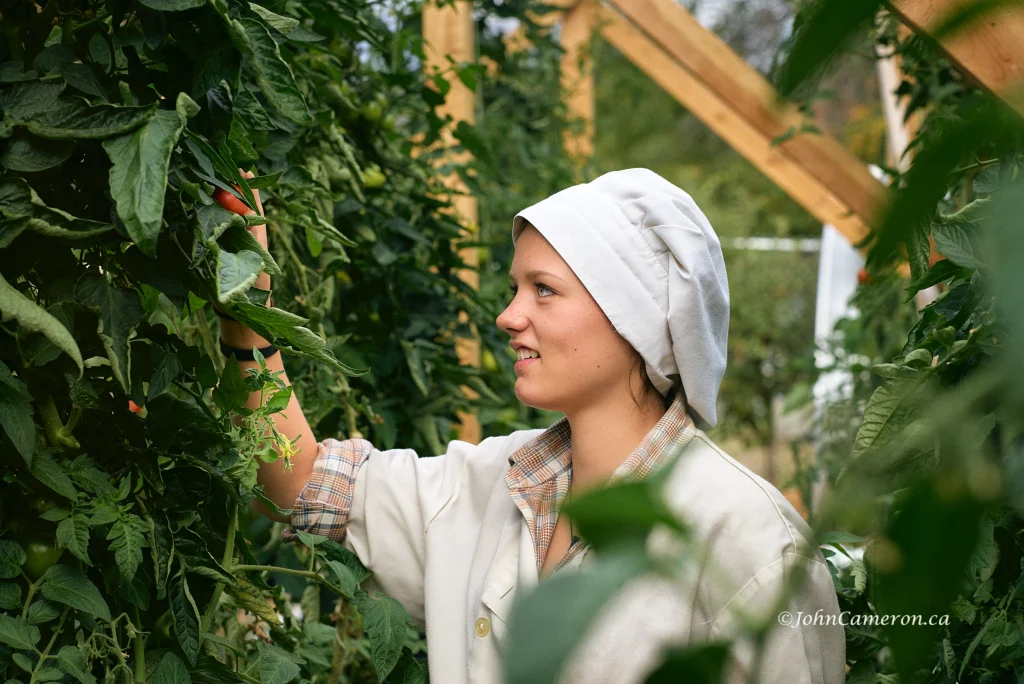 Below is the opposite kind of image. An arranged image of a cafeteria student in the school garden picking ingredients for the day’s lunch menu items.