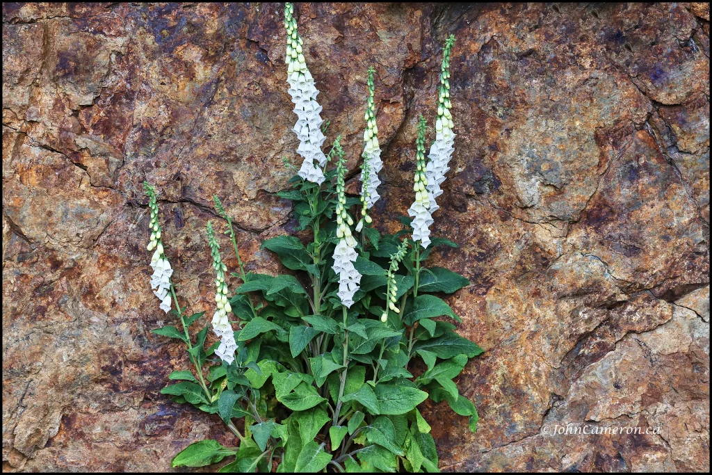Some south facing Foxgloves posing against a driveway wall noticed while on a bright, but overcast morning walk.